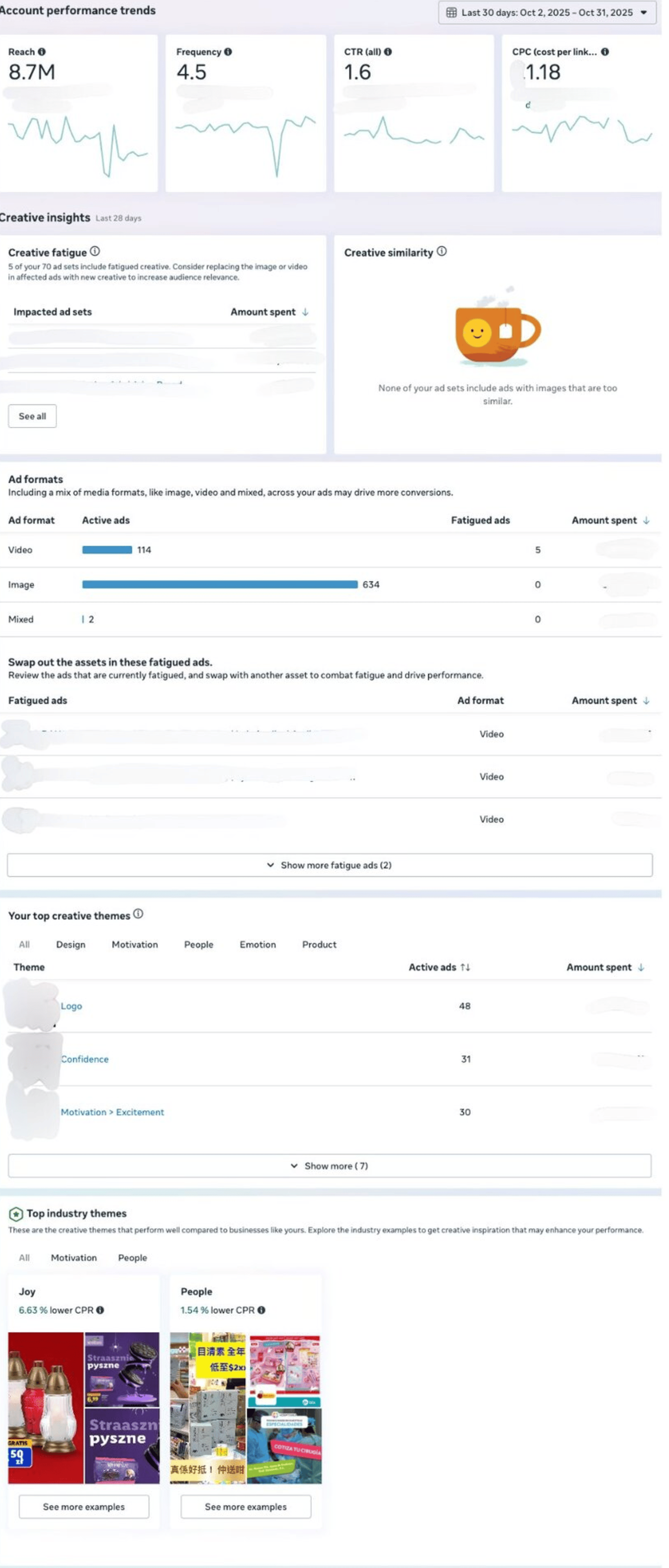 Meta je uvela Account Insights Tab koji pokazuje koji vizuali su dostigli kreativni zamor. Ja sam blago skeptičan prema toj metrici kao i prema većini ne-brojčanih metrika (ne volim je uzimati kao apsolutnu istinu), ali mislim da može biti relativno OK orijentir.