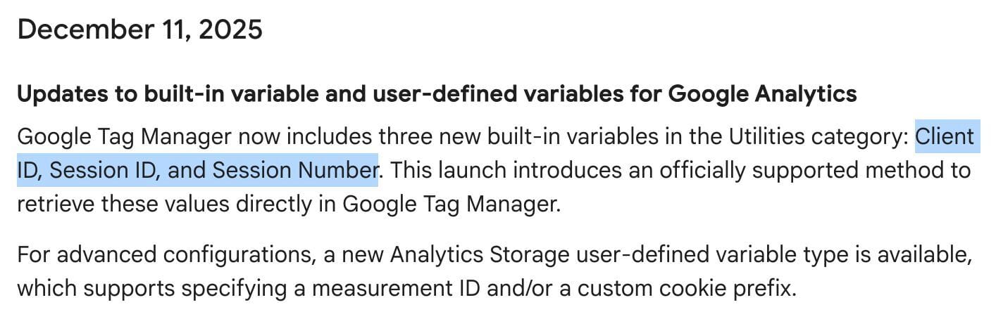 Google Tag Manager ima tri nove varijable: Client ID, Session ID i Session Number.